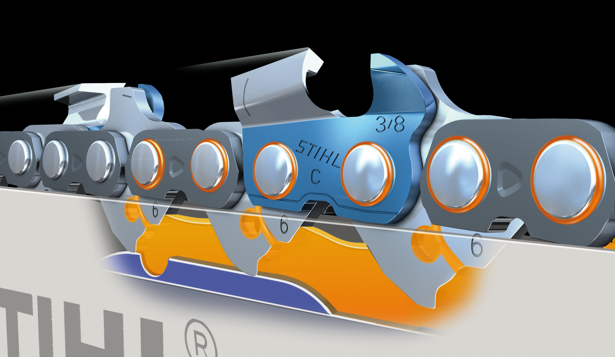 - Spetsiaalne stantsimisprotsess muudab STIHLi saekettide ühendusavad peegelsiledaks. See parandab keti liikuvust ja pikendab keti kasutusiga.